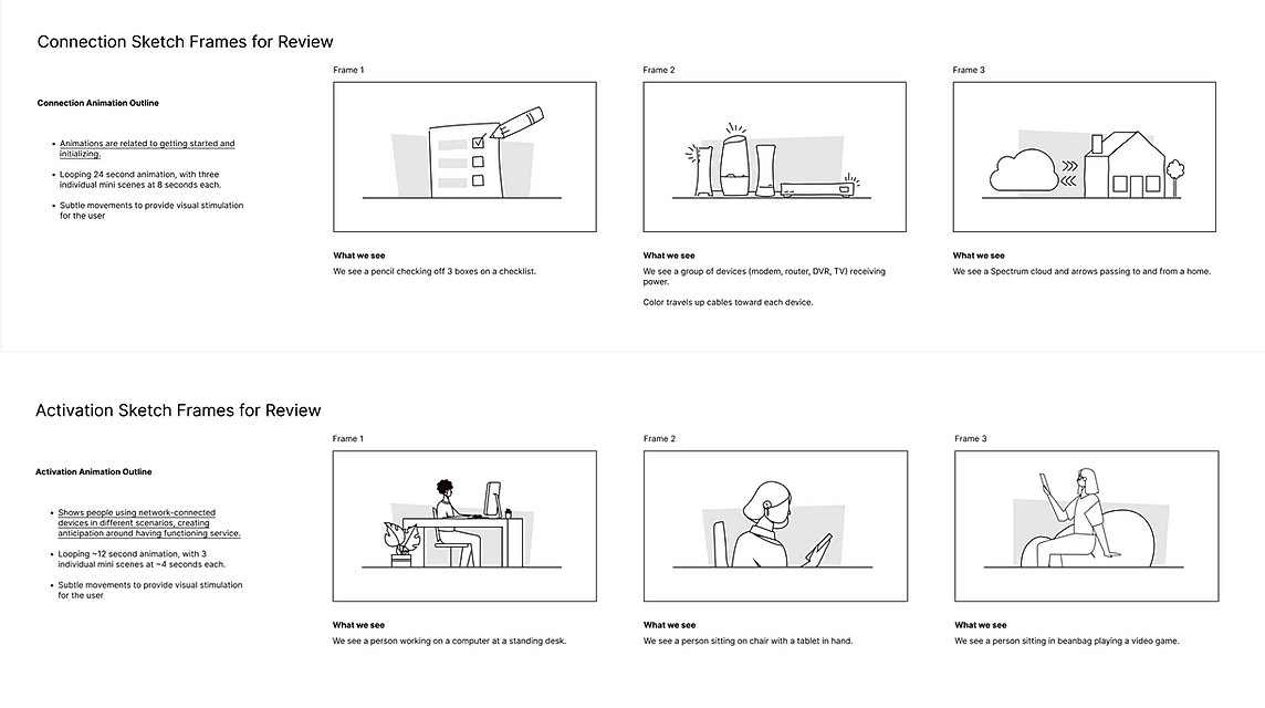 Knowing the long wait times were problematic, I collaborated with the data & engineering teams to understand activation and connection times across different equipment types, allowing me to tailor the user experience more specifically for each device type the user is installing. We discovered the average time to be 5 minutes but successful outliers reaching 25-30 minutes, giving us a wide range of time to have to work around.